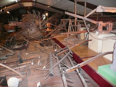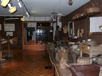明治から大正・昭和の半ばまで人々に使われた道具類は、ほとんどが生活に密着したものでした。 機織機、糸車、石臼、炬燵などの生活用具から、牛馬を使い、犁で田を耕起して馬鍬でならす当時 の農業用具まで、多くの民具を展示しています。 |